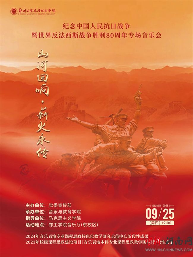 中新河南網(wǎng)9月25日電 2025年是中國人民抗日戰(zhàn)爭暨世界反法西斯戰(zhàn)爭勝利80周年。這場偉大戰(zhàn)爭是中華民族歷史上的一座重要里程碑,中國人民以巨大的民族犧牲和精神力量,為世界反法西斯戰(zhàn)爭的勝利作出了不可磨滅的貢獻。為銘記這段烽火歲月,弘揚偉大的抗戰(zhàn)精神,鄭州工業(yè)應(yīng)用技術(shù)學院將于9月25日19:00在東校區(qū)音樂廳舉辦 “山河回響・薪火永傳” ——紀念中國人民抗日戰(zhàn)爭暨世界反法西斯戰(zhàn)爭勝利80周年專場音樂會。