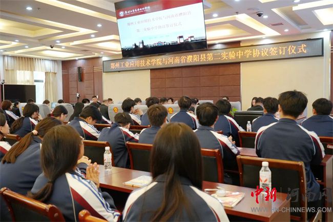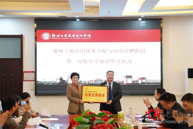 中新河南網(wǎng)10月17日電 10月16日,鄭州工業(yè)應(yīng)用技術(shù)學(xué)院與河南省濮陽縣第二實驗中學(xué)生源基地協(xié)議簽訂儀式在行政管理中心二樓會議室舉行。此次簽約,不僅是鄭工學(xué)院發(fā)展史上開啟教育新篇章的重要征程,更是通過與基礎(chǔ)教育領(lǐng)域優(yōu)質(zhì)學(xué)校的深度融合,將共建生源基地轉(zhuǎn)化為推動校地教育協(xié)同的具體實踐。濮陽縣第二實驗中學(xué)教育集團董事長蔡玉坤,校長張克來、副校長段盈武等班子成員及師生代表;中原華信控股集團總裁、鄭州工業(yè)應(yīng)用技術(shù)學(xué)院理事長谷建光,校長閆兵攜班子成員、有關(guān)部門負責(zé)人參加簽訂儀式。簽訂儀式由鄭州工業(yè)應(yīng)用技術(shù)學(xué)院副校長賈圣強主持。
