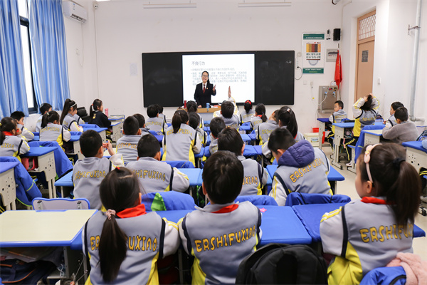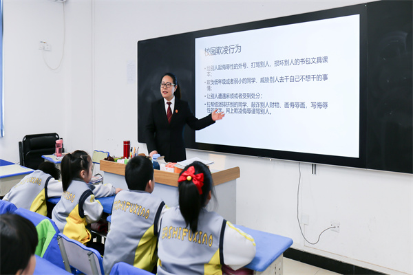 課堂上,為吸引學生們注意力,活躍課堂氣氛,王梅芳局長通過PPT形式,從法官、法槌、法袍、法徽所代表的意義和作用到如何正確地用法律保護自己,用簡單易懂,活潑詼諧的語言,通過一個個涉未成年人犯罪典型案例,向?qū)W生們講述了有關(guān)未成年人犯罪、不良行為及校園欺凌的法律知識,引導學生們從小養(yǎng)成自覺學法、知法、守法意識,提高自我保護能力,自覺抵制各種不良行為及違法犯罪的誘惑。整堂課上學生們聽得津津有味,并積極參與互動,踴躍回答問題,課堂氣氛活躍,取得了良好的法治教育效果。課堂結(jié)束后,王梅芳局長為學生們送上了學習用品,得到了師生們的一致好評。最后,學校老師為王梅芳局長頒發(fā)榮譽聘書,特聘請王梅芳局長為“家長講堂”特聘講師。