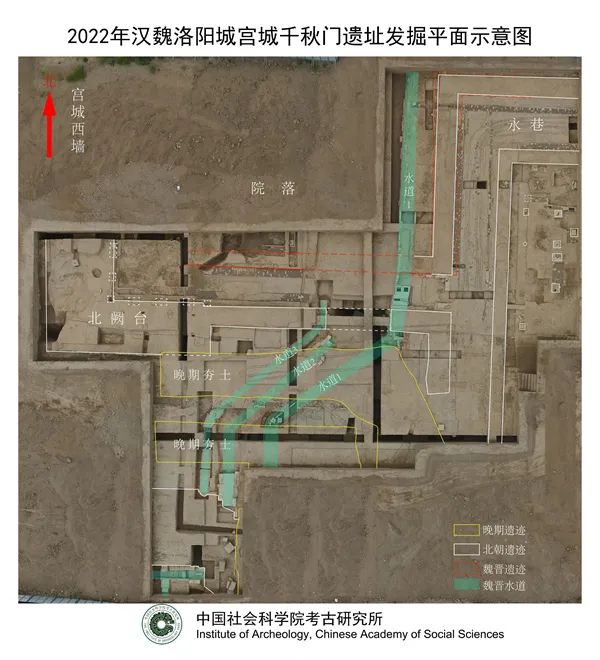 2022年春,考古人員在對千秋門門址進行的考古解剖發(fā)掘中,發(fā)現(xiàn)了漢代、魏晉、北魏時期磚砌、石砌水道遺跡。這些遺跡屬于漢魏時期向?qū)m城內(nèi)引水和向?qū)m城內(nèi)排水的城市水利系統(tǒng)的重要組成部分。其中發(fā)現(xiàn)的不晚于漢代的大型磚砌拱券式水道,由內(nèi)外兩重砌磚構(gòu)成,內(nèi)寬1.2米,不僅結(jié)構(gòu)完整、規(guī)模巨大,而且也是漢魏洛陽城早期建筑遺跡的重要發(fā)現(xiàn)。